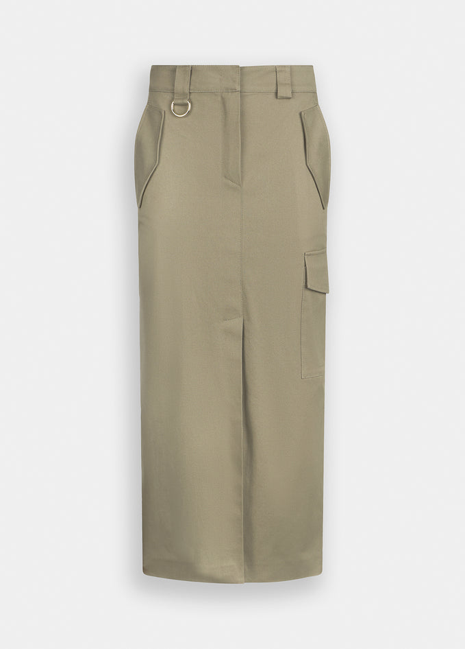 Gonna lunga in gabardina di cotone stretch con tasche sui fianchi, tasca cargo, spacco sul davanti, chiusura con zip coperta e fodera interna. Made in Italy. Composizione: tessuto principale 98% cotone, 2% elastan; fodera principale 68% acetato, 32% poliestere. Lavaggio: lavare delicatamente max 30°C, non trattare con cloro, lavare delicatamente a secco con tetracloroetilene, lavare a rovescio. Asciugatura: non usare asciugatrice. Stiraggio: non stirare, stirare a temperatura massima 110°C, non stirare le decorazioni. Codice prodotto CF5349 T026AX0707 A25