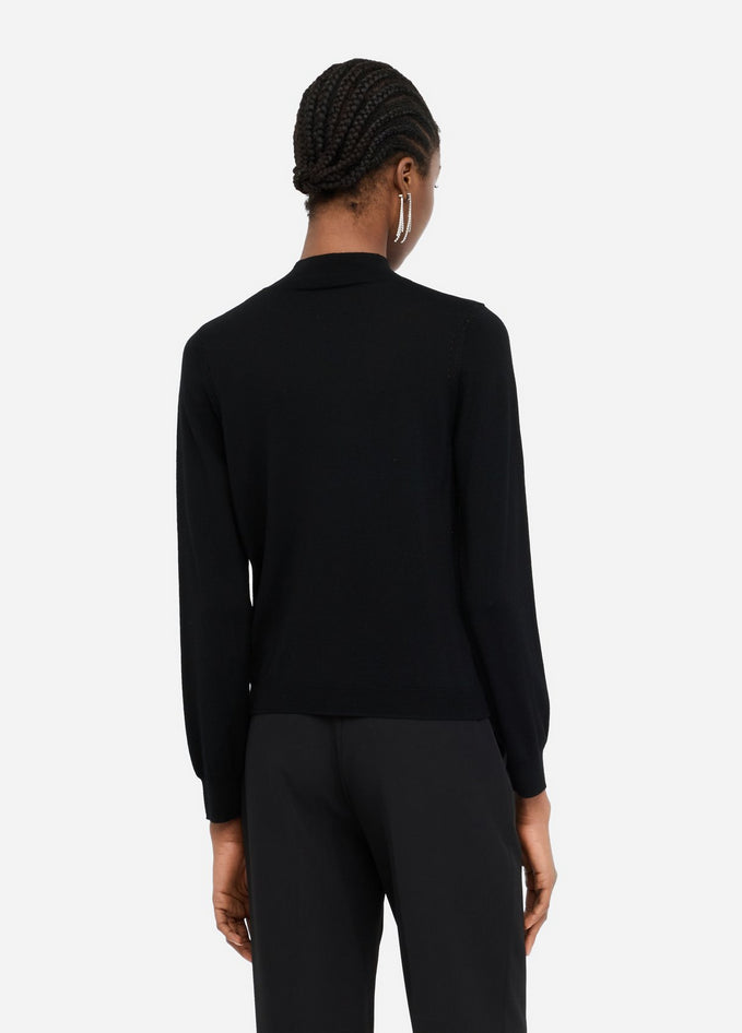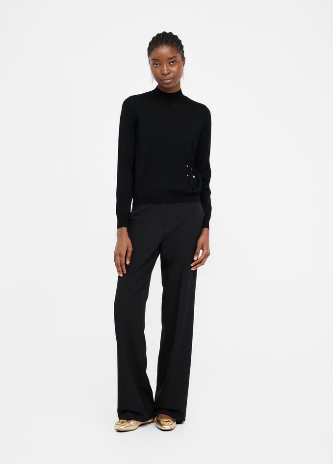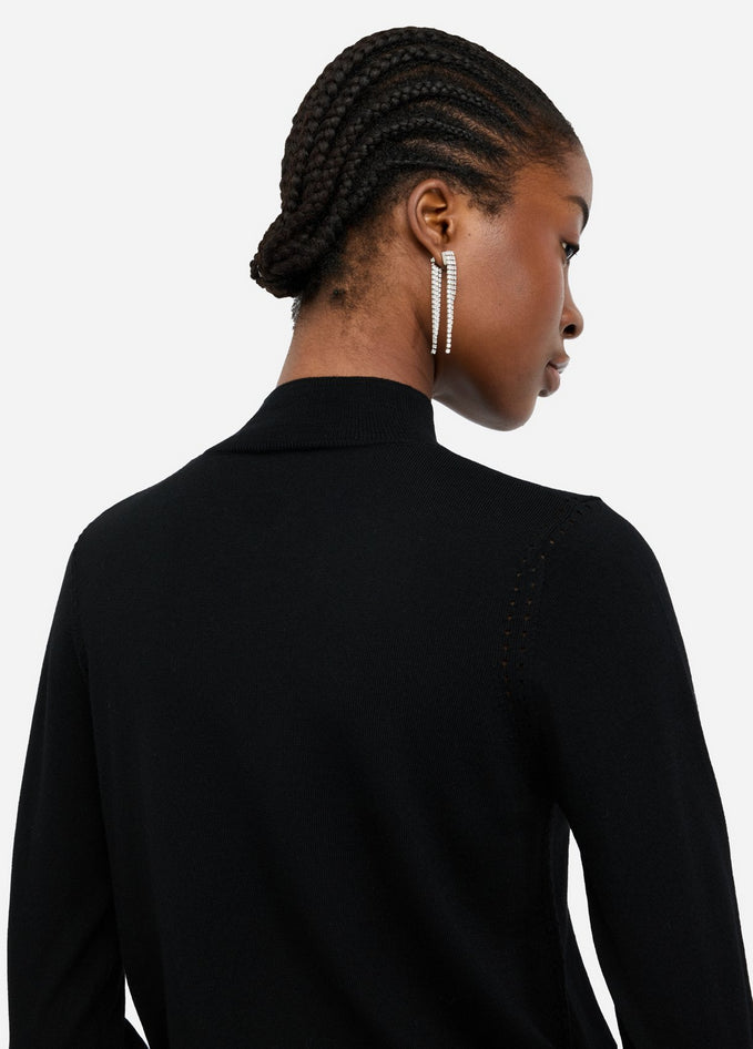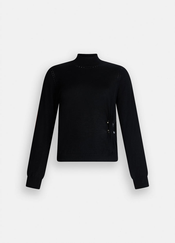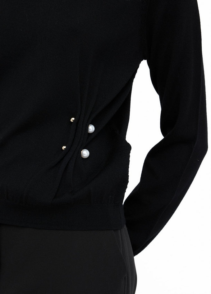 Maglia nera realizzata in lana con motivo arricciato decorato da perle, collo alto, maniche lunghe e bordi a costine. Composizione: tessuto principale 100% lana vergine. Lavaggio: lavare a mano, non trattare con cloro, lavare delicatamente a secco con tetracloroetilene, lavare a rovescio, non strofinare durante il lavaggio. Asciugatura: non usare asciugatrice, asciugare in piano. Stiraggio: stirare a temperatura massima 110°C interponendo un panno.Codice prodotto CF5041 MA82O22222 A25
