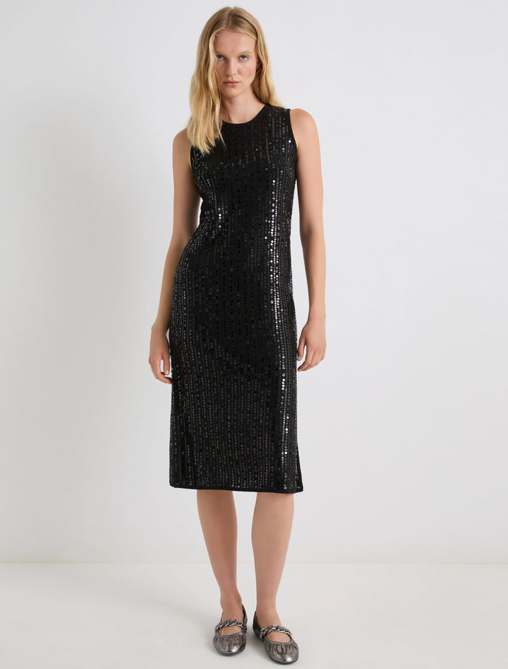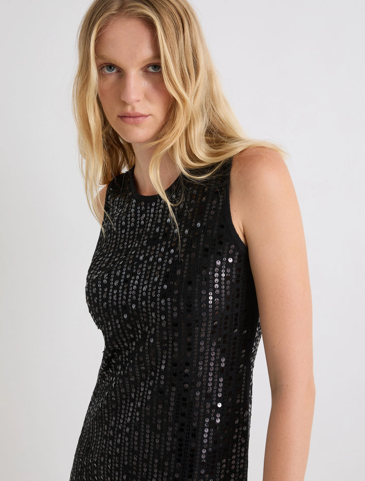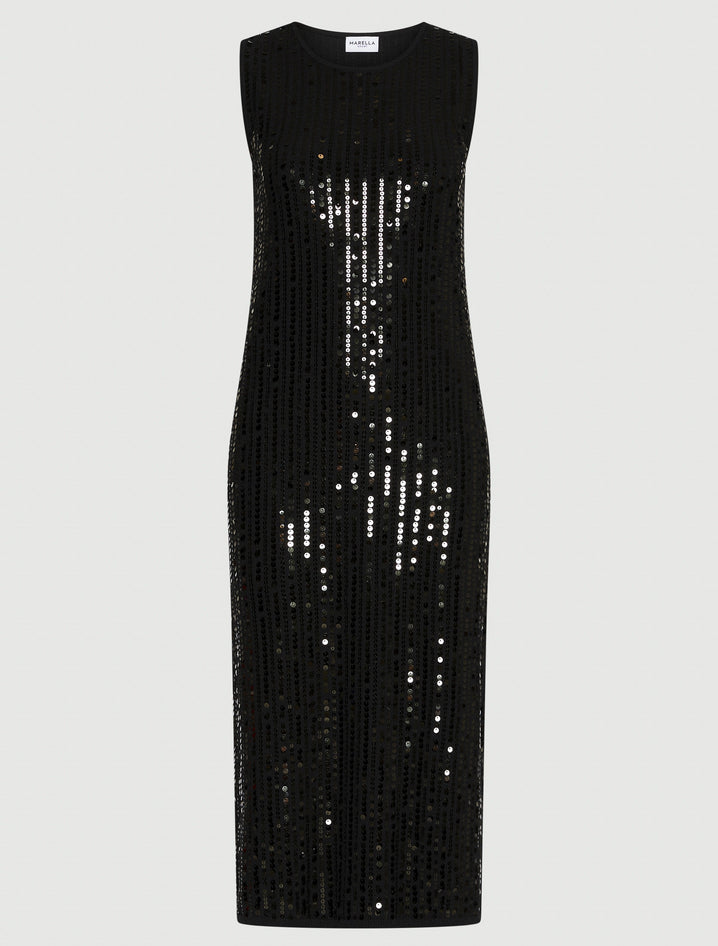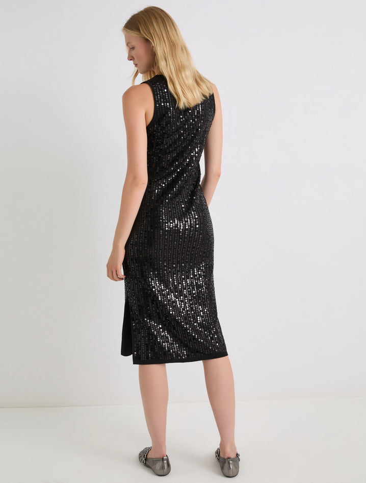Il lato scintillante della moda prende forma in questo nuovo abito smanicato in maglia bouclé, impreziosito da paillettes ricamate che donano un elegante effetto luminoso. La silhouette è valorizzata dai tagli sagomati e dalle pince, che mettono in risalto la figura e conferiscono una vestibilità aderente e femminile. Il design essenziale ma sofisticato è completato dallo scollo stondato e dallo spacco laterale che aggiunge un tocco di sensualità discreta. Capo sfoderato, perfetto per occasioni speciali o serate eleganti. Cura e Manutenzione: filato in maglia 78% cotone, 22% poliammide; filo di legatura 100% poliestere; decorazioni escluse. Lavaggio a mano in acqua fredda max 40°, non candeggiare, non asciugare in tamburo, asciugare in piano all'ombra, ferro tiepido max 120°C, non lavare a secco, non lavare ad umido professionale, usare un panno tra capo e ferro, usare detersivo neutro, rovesciare il capo prima del lavaggio e stirare a rovescio. Codice prodotto ADDETTO 2523326024270004 A25