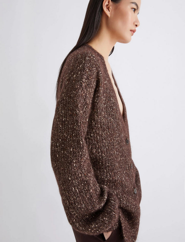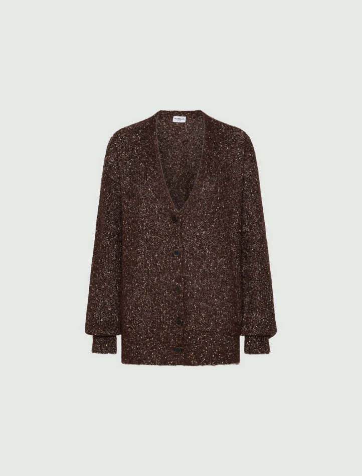 Affronta la nuova stagione con un cardigan cocoon: il filato con mohair e alpaca avvolge morbidamente le forme enfatizzando la costruzione con spalla scesa e lunghezza sotto i fianchi. Cardigan in mohair e alpaca con filato bottonato, fit morbido, scollo a V profondo con bottoni in simil corno personalizzati, spalla scesa, fondo capo e polsi lavorati a costine. Composizione: 36% acrilica, 30% poliammide, 17% alpaca, 17% mohair. Lavaggio: lavare a mano in acqua fredda max 40°, non candeggiare, non asciugare in tamburo, asciugare in piano in ombra, ferro tiepido max 120 °C, lavare a secco delicato con percloroetilene, non lavare ad umido professionale, usare un panno tra capo e ferro, usare detersivo neutro, rovesciare il capo prima del lavaggio, stirare a rovescio. Codice prodotto ARANCIO 2523346074200002 A25