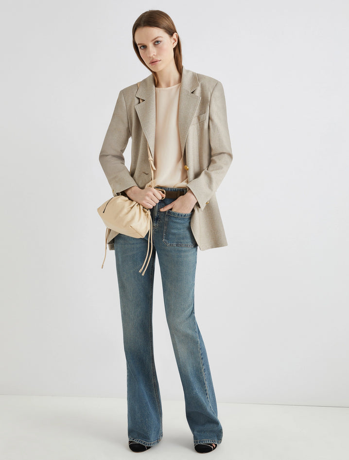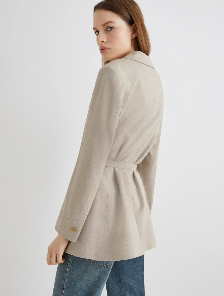 Cool sopra una t-shirt, elegante sulla camicia: il blazer in saglia stabilisce una nuova femminilità fatta di linee pulite e attitude contemporanea. Con cintura, per una silhouette da modulare a piacere. Blazer in saglia tinto filo smerigliata di misto lana, viscosa e cotone, con fodera, fit regolare, scollo con rever e impunture a vista, chiusura monopetto con bottone e cintura, tasche laterali con patta e spacco centrale posteriore. Composizione: tessuto 33% poliestere, 25% cotone, 19% lana, 16% viscosa, 6% poliammide, 1% elastan, fodera 64% acetato, 36% poliestere. Lavaggio: non lavare in acqua, non candeggiare, non asciugare in tamburo, ferro tiepido max 120 gradi C, lavare a secco delicato con percloroetilene, non lavare ad umido professionale, lavare la cintura in un sacco di rete. Codice prodotto CUNEO 2523046122270001 A25