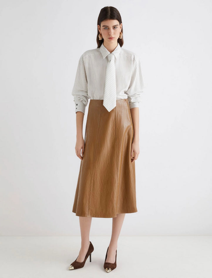 Linea svasata e pannelli con impunture a vista: la nuova gonna unisce linee femminili classiche al tocco urbano della saglia spalmata. Da provare con il trench coordinato per un mix cromatico e materico sorprendente. Realizzata in saglia spalmata, ha fit svasato con punto vita aderente, costruzione a spicchi con impunture a vista e apertura laterale con zip. Composizione: tessuto 74% viscosa, 15% poliestere, 7% cotone, 4% fibra metallica, strato ricoprente in poliuretano, fodera 64% acetato, 36% poliestere. Lavaggio: lavare a mano in acqua fredda max 40°, non candeggiare, non asciugare in tamburo, asciugare appeso in ombra, non stirare, lavare a secco delicato con percloroetilene, non lavare ad umido professionale. Codice prodotto FALANGE 2523106071270002 A25