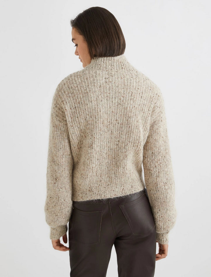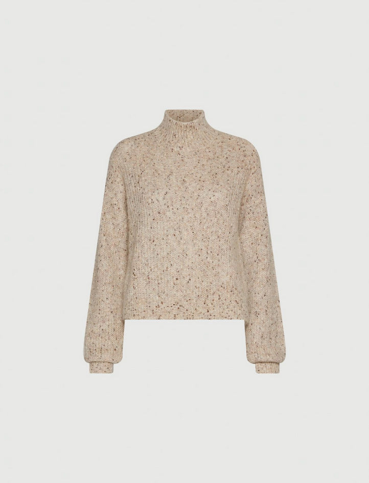 Maglia in morbido misto mohair e alpaca con filato bottonato, fit morbido, collo rialzato, spalla scesa e maniche ampie, polsi e fondo lavorati a costine. Composizione: 36% acrilica, 30% poliammide, 17% alpaca, 17% mohair. Lavaggio: lavare a mano acqua fredda max 40°C, non candeggiare, non asciugare in tamburo, asciugare in piano in ombra, stirare a ferro tiepido max 120°C, lavare a secco delicato con percloroetilene, non lavare ad umido professionale, usare panno tra capo e ferro, usare detersivo neutro, rovesciare il capo prima del lavaggio, stirare a rovescio. Codice prodotto DELIA 2523366334200001 A25