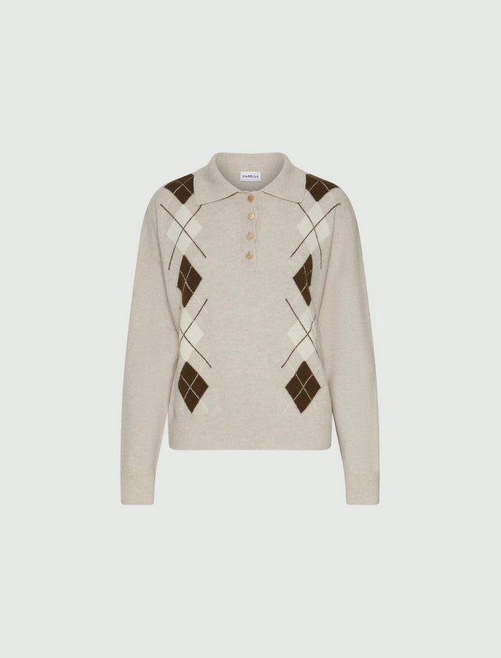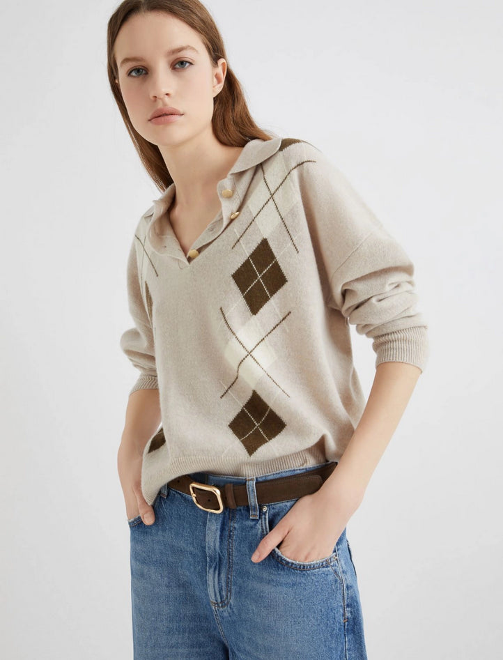 Polo in maglia di misto cashmere con intarsi geometrici a rombi sul busto, fit regolare, collo a polo, spalla scesa e finiture a costine su polsi, collo e fondo. Composizione: 95% lana, 5% cashmere. Lavaggio: a mano in acqua fredda max 40°, non candeggiare, non asciugare in tamburo, asciugare in piano in ombra, ferro tiepido max 120°C, lavare a secco delicato con percloroetilene, non lavare ad umido professionale, usare un panno tra capo e ferro e detersivo neutro. Codice prodotto CAVIALE 2523366312270006 A25
