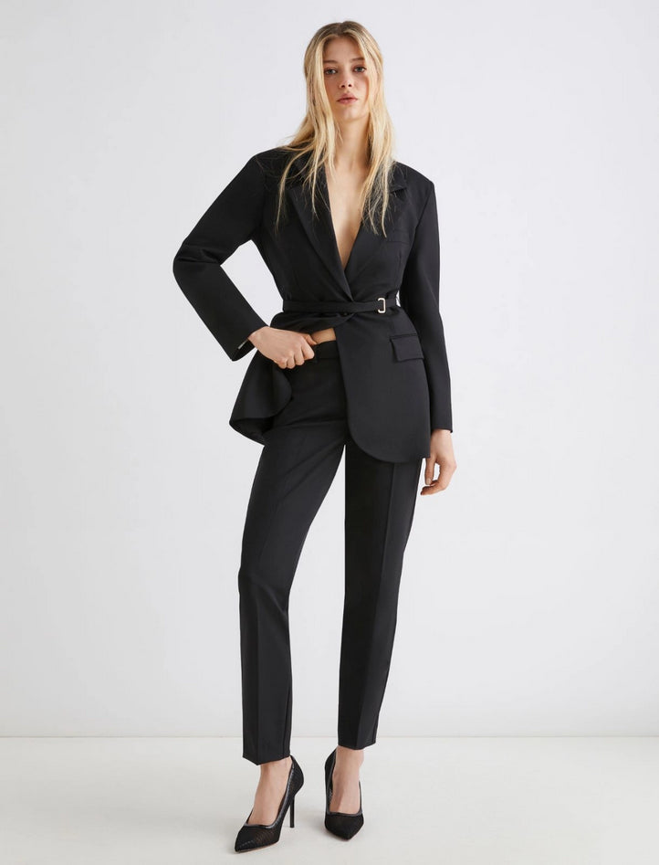 Pantalone in tessuto di misto lana stretch con effetto diagonale, fit regolare, chiusura con gancio e zip nascosti, cintura con passanti, piega stirata fronte e retro, tasche laterali alla francese e posteriori a filetto. Composizione: 53% poliestere, 43% lana vergine, 4% elastan. Lavaggio: lavare a mano acqua fredda max 40°, non candeggiare, non asciugare in tamburo, asciugare appeso in ombra, ferro tiepido max 120 gradi c, lavare a secco delicato con percloroetilene, non lavare ad umido professionale. Codice prodotto OPACO 2523136101270001 A25