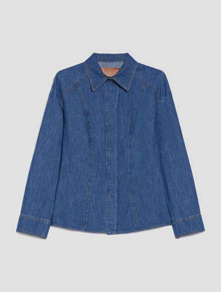 Versatile e sempre attuale, la camicia slim in denim leggero di puro cotone è il capo perfetto da abbinare sia a jeans sia a pantaloni classici, da indossare sotto un pull morbido o un blazer sartoriale. Il taglio slim con pinces al busto valorizza la figura, mentre il colletto classico, le spalle scese e le maniche lunghe ne definiscono lo stile essenziale e raffinato. L'abbottonatura nascosta, il carré sul retro e gli spacchetti laterali completano il design. Composizione: 100% cotone. Lavaggio in lavatrice max 30°, azione meccanica ridotta; non candeggiare; non asciugare in tamburo; asciugare appeso in ombra; stirare a temperatura massima di 120°; non lavare a secco. Lavare il capo allacciato e separatamente, sempre rovesciato. Evitare il contatto con indumenti o superfici chiare, poiché il denim può stingere, specialmente con il calore o l'umidità. Appendere al rovescio evitando l'esposizione diretta alla luce e non tentare di rimuovere macchie isolate. Codice prodotto ANTIOPE 2521116073200001 A25