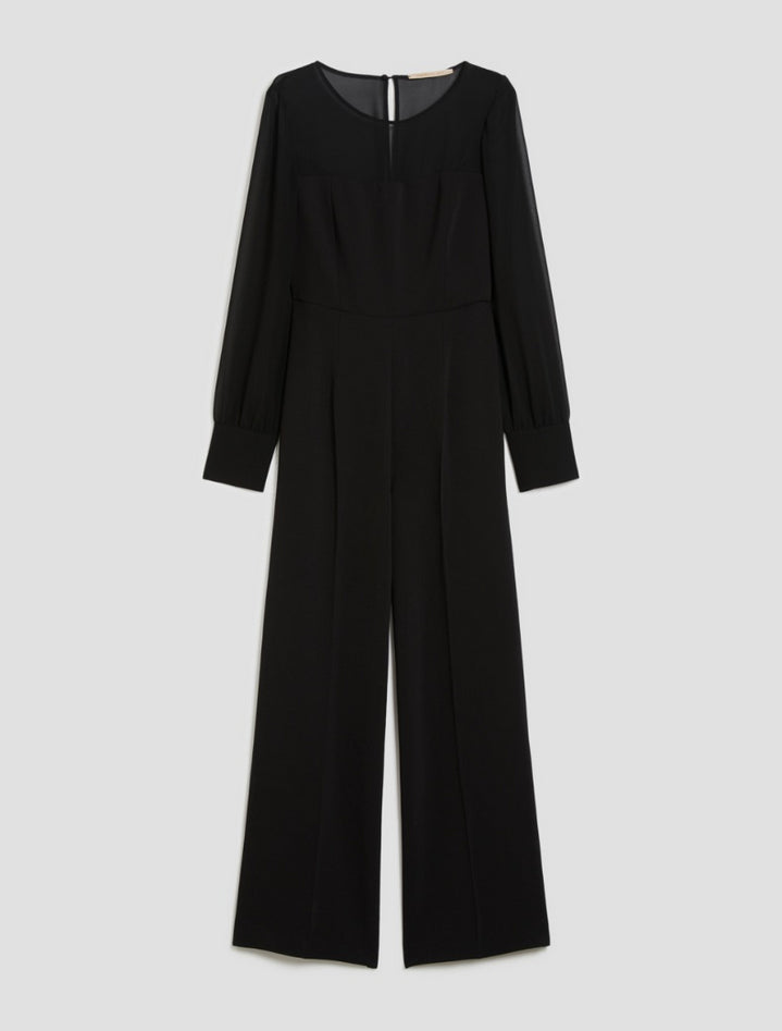 Tuta elegante in cady bi-stretch, caratterizzata da un design pulito e sofisticato che gioca con delicate trasparenze in georgette su carré e maniche. Il top dal taglio slim si abbina a pantaloni ampi a palazzo con piega stirata, creando una silhouette fluida e raffinata. Il girocollo, i polsi alti con bottone bijou e l'apertura a goccia con zip invisibile sul retro completano il look con tocchi di femminilità discreta. Capo parzialmente foderato, perfetto per serate e party très chic. Composizione: tessuto 1 92% poliestere, 8% elastan; tessuto 2 100% poliestere; fodera 62% acetato, 38% poliestere. Lavaggio: non lavare in acqua, non candeggiare, non asciugare in tamburo, stirare a bassa temperatura (max 120°), lavaggio a secco delicato con percloroetilene, non lavare ad umido professionale; lavare il capo allacciato; contiene parti non tessili di origine animale. Codice prodotto COMO 2521246022200009