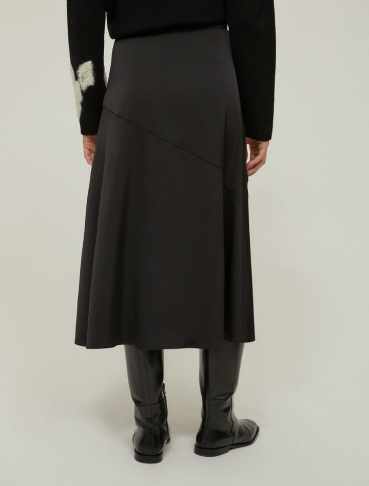 Gonna midi in raso dal design asimmetrico, reinterpretazione contemporanea di un classico dello chic femminile. Realizzata in raso fluido contenente oltre il 50% di poliestere riciclato, presenta linee svasate che seguono con eleganza i movimenti del corpo. La balza a godet tagliata in diagonale e lo spacco frontale aggiungono dinamismo e femminilità, mentre la vita regolare e la zip invisibile al fianco garantiscono una vestibilità impeccabile. Capo sfoderato, perfetto con un pull morbido di giorno o un top sofisticato di sera. Codice prodotto FOX 2521106092200009 A25