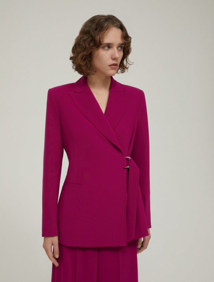 Realizzato in cady bi-stretch, il blazer reinterpreta il tailoring classico con una silhouette slim e un'allacciatura asimmetrica che valorizza la figura. Il design presenta spalle strutturate, ampi revers a lancia, tasche a filo e impunture sartoriali tono su tono sul davanti. La chiusura sovrapposta con laccio e fibbia in metallo aggiunge un dettaglio distintivo. Capo foderato. Composizione: tessuto 92% poliestere, 8% elastan; fodera 62% acetato, 38% poliestere. Lavaggio: non lavare in acqua, non candeggiare, non asciugare in tamburo, stirare a temperatura massima di 120°C, lavare a secco delicato con percloroetilene, non lavare ad umido professionale, proteggere la fibbia prima del lavaggio. Codice prodotto RACE 2521046152200003 A25
