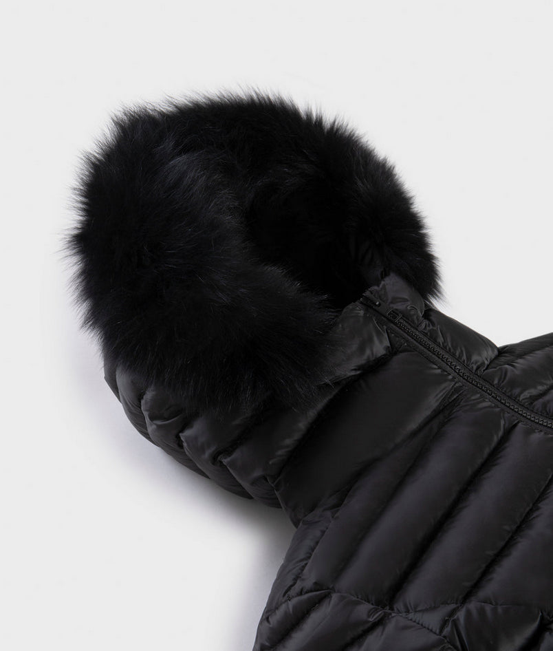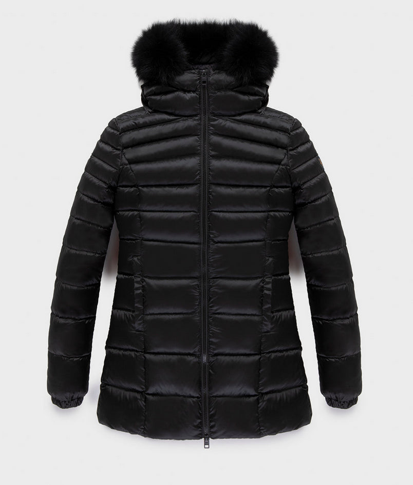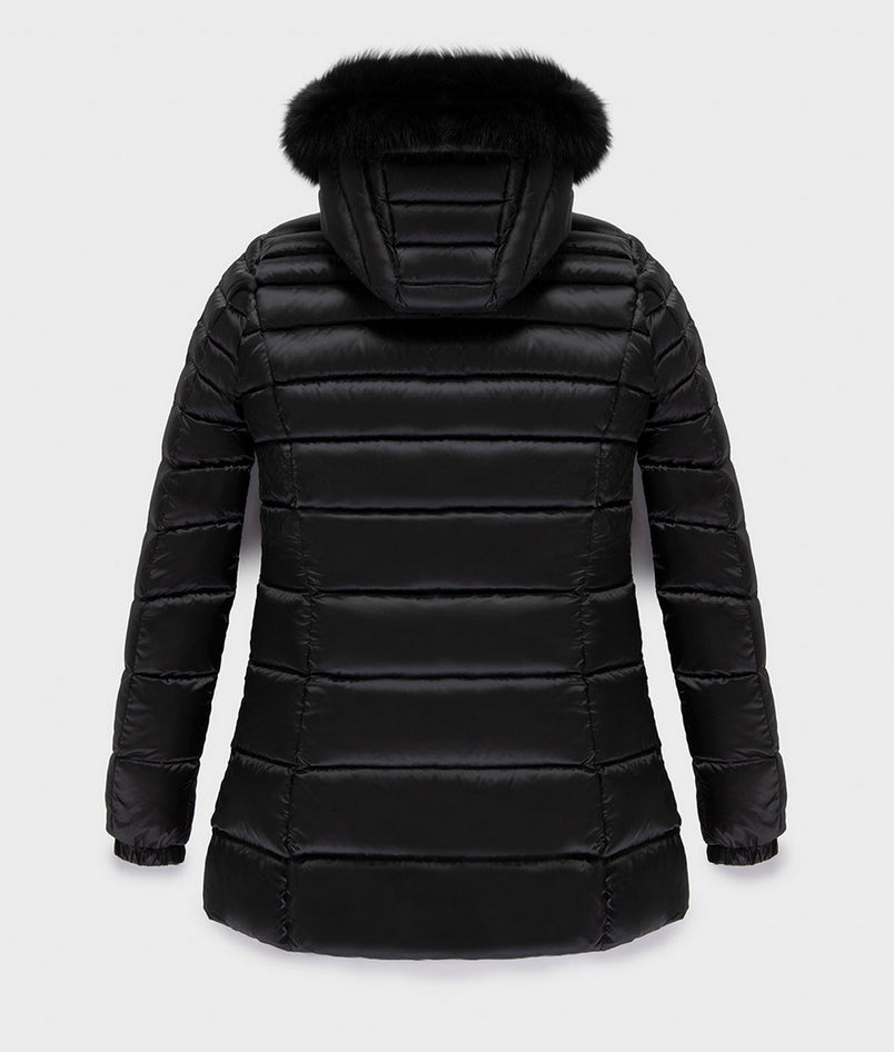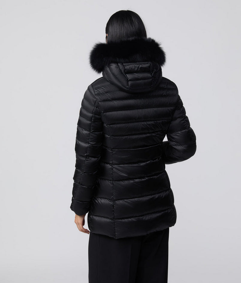 Long Mead Fur Jacket, piumino invernale da donna ¾ con bordo in pelliccia, realizzato in nylon raso superleggero antivento e idrorepellente dall'aspetto leggermente iridescente. Imbottitura in 100% piuma 90-10 RDS a iniezione diretta, leggera e calda. Trapunta orizzontale tradizionale, fit femminile versatile, chiusura con zip e cursore personalizzato, cappuccio con bordo in pelliccia, polsini elastici antivento e tasche frontali a scomparsa. Logo patch sul braccio sinistro. Capo elegante, pratico e confortevole, adatto a temperature fredde. Composizione: esterno 60% poliestere, 40% nylon; fodera 100% nylon; imbottitura 100% piuma 90-10 RDS (Responsible Down Standard). Codice prodotto RA0035 W98118G06000 A25