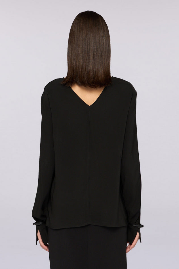 Stile senza tempo e raffinatezza si fondono in una blusa dal taglio essenziale, realizzata in tessuto fluido di viscosa che disegna una silhouette morbida e femminile; lo scollo a V sulla schiena aggiunge un tocco di elegante discrezione, mentre le fibbie decorative sui polsi, dettaglio distintivo che richiama l'heritage artigianale di Trussardi, conferiscono un'eleganza sofisticata. Versatile e chic, questa blusa si adatta perfettamente sia all'ufficio sia alle occasioni speciali, abbinandosi con naturalezza a pantaloni sartoriali o a una gonna a matita per un look impeccabile e contemporaneo. Realizzata in tessuto fluido di viscosa, con scollo a V sulla schiena, fibbie decorative sui polsi e vestibilità regular. Nessun lavaggio in acqua, non asciugare a tamburo, non usare candeggina, lavaggio a secco P moderato, stiro max 110° C. Composizione tessuto principale: 94% viscosa, 6% elastan. Codice prodotto 2537A0 09QR33 A25